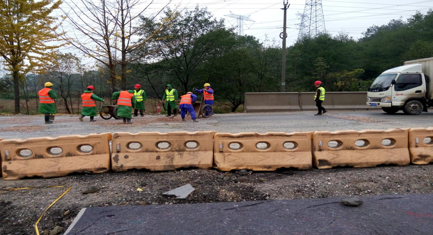 2016年11月22日下午4時(shí)許,由于連續(xù)降雨,加上G318重載車(chē)輛較多,導(dǎo)致臨時(shí)通行段東蓉橋兩端路基出現(xiàn)嚴(yán)重坑洼,影響道路通行速度及安全。為此,安徽路港G318改建工程項(xiàng)目經(jīng)理部迅速響應(yīng),緊急組織青年突擊隊(duì)員共計(jì)16人冒雨前去搶修。
