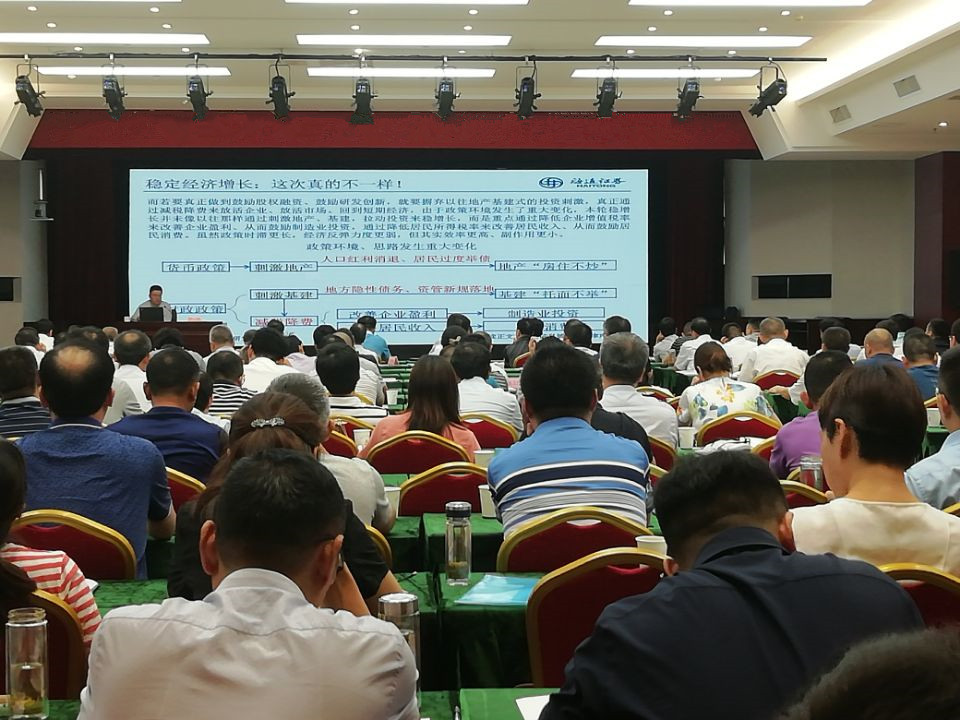 海通證券于博老師從我國國情出發(fā),緊密圍繞人口紅利消退、舉債發(fā)展經(jīng)濟,債務(wù)周期見頂、去杠桿四步曲,貿(mào)易摩擦再現(xiàn)、短期迎來休戰(zhàn),轉(zhuǎn)型勢在必行、經(jīng)濟緩慢筑底,降利率提估值、從實物到金融等五個方面,宏觀分析了國內(nèi)經(jīng)濟發(fā)展情況,并對2019年下半年經(jīng)濟及資本市場進行了展望。本次講座內(nèi)容豐富翔實、圖文并茂,與會人員聚精會神地聆聽,并認真地做筆記。
