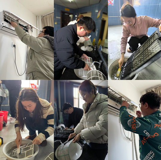 活動期間,大家分工協(xié)作、互相配合。志愿者先對空調(diào)進(jìn)行斷電,打開空調(diào)蓋板,取出空調(diào)濾網(wǎng),接著使用抹布和清洗劑對空調(diào)外機(jī)、濾網(wǎng)等部件進(jìn)行全面細(xì)致的清洗。