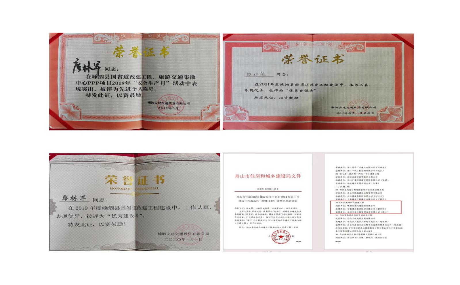 526國道嵊泗項目獲得了 2024 年舟山市建設工程海山杯(優質工程)獎,廖林軍也積累了豐富的施工管理經驗,多次被項目公司評為“優秀建設者”。